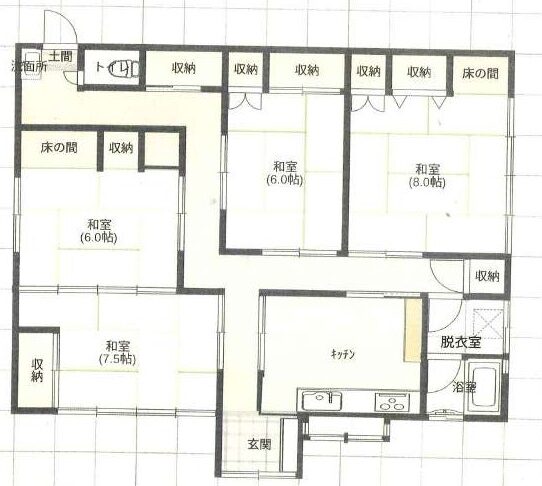 4台駐車可能な広い敷地の中に建つ平屋建ての住宅